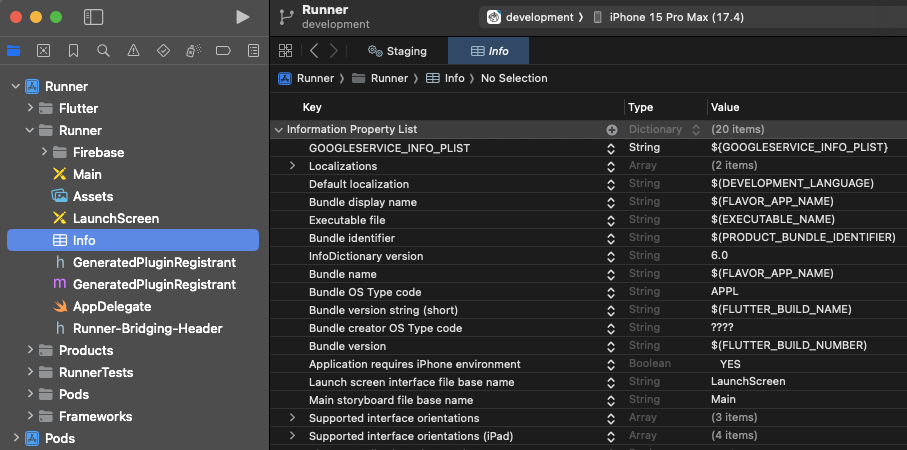 - Move the downloaded “GoogleService-Info.plist” file from “Runner” into the respective development environment folder we just created whenever we run the flutterfire config for each environment.