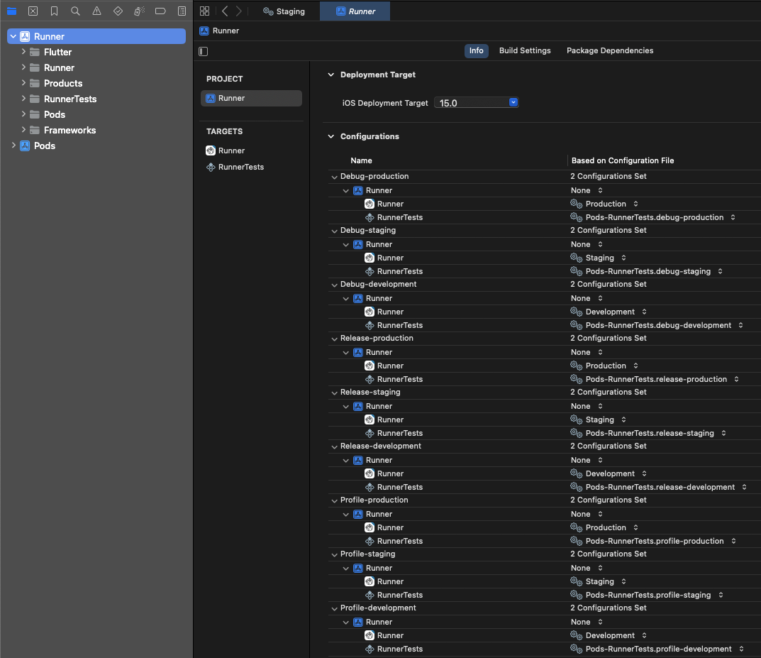 Now go to Runner -> PROJECT -> Runner -> Info, under Configurations, replace where it says Debug, Profile and Release with the respective Development Environments as shown in the image below.